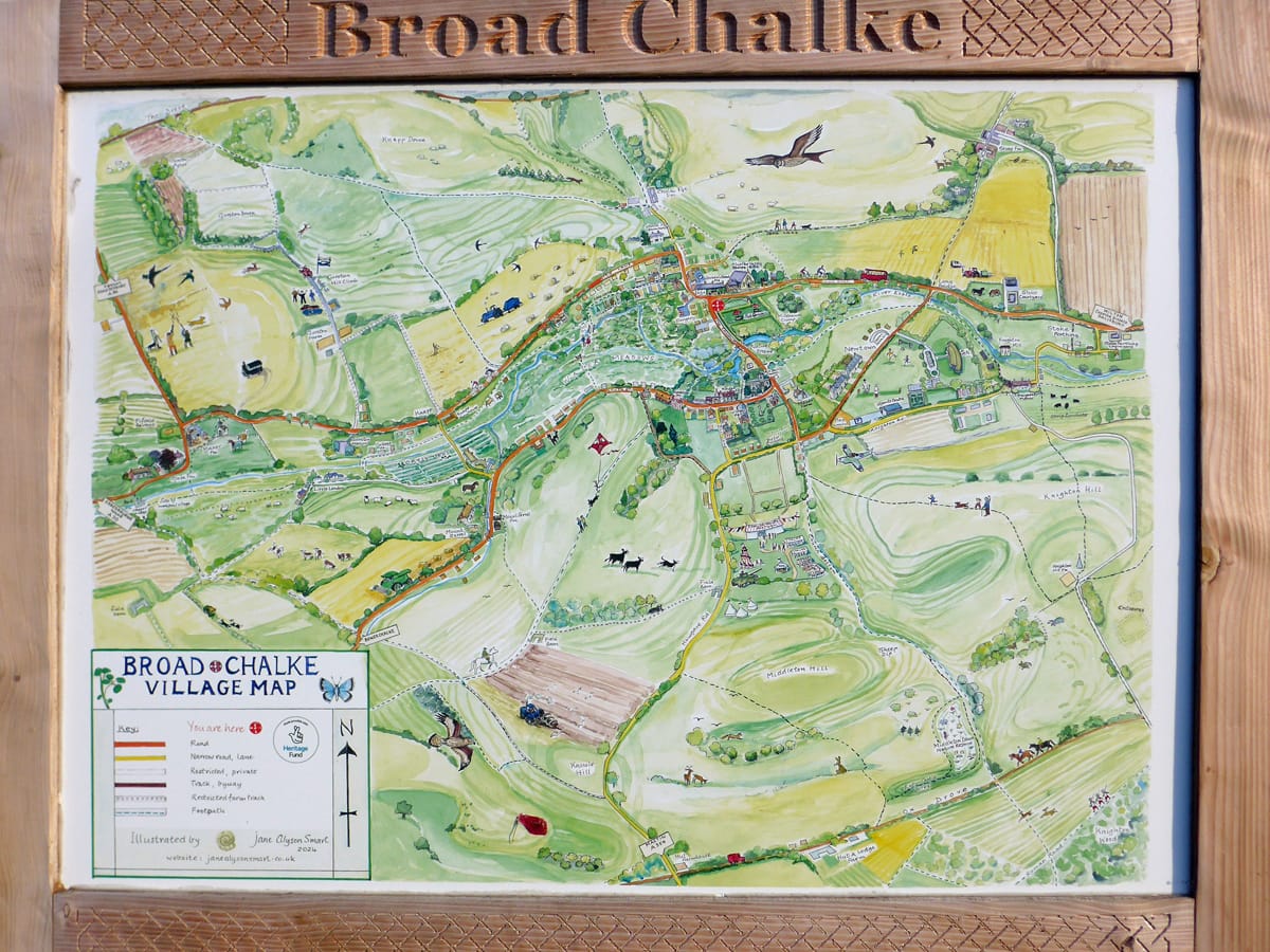 The village of Broad Chalke is part of the West Wiltshire Downs Area of Outstanding Natural Beauty meaning that it belongs in a protected, high value landscape subject to conservation regulations. The village map (below) shows it situated within an essentially rural landscape, despite its closeness to the busy A30. The painted and framed map seems designed for visitors not residents and reflects the careful conservation of the village.