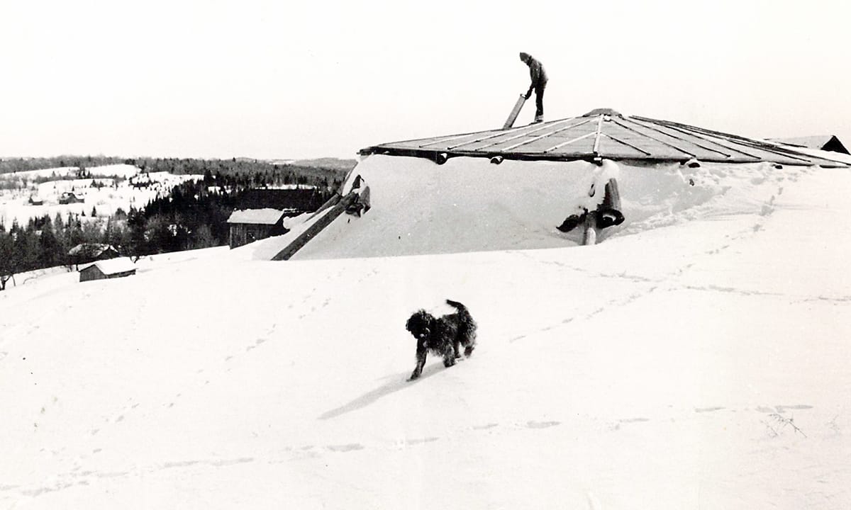 David on the roof of the octagonal house, with Nabob the dog (Winter 1971)